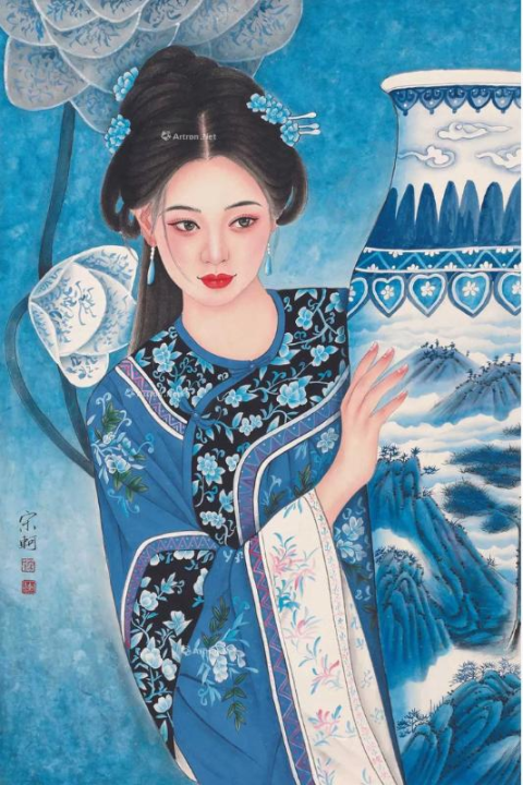 當青花的冰裂紋理與仕女的婉約風姿在宣紙上交融,宋軻的《青花入