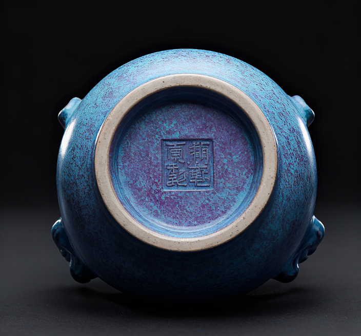 從釉色來看,這件尊的爐鈞釉呈現出獨特的「紅藍交輝」之態 —— 釉面中紅色如晚霞般絢麗,藍色似深海般沉穩,兩種色彩相互交融滲透,形成「爐鈞釉獨有的「雲霞狀」窯變效果,無一處相同,可謂「天工之作」。據史料記載,雍正皇帝對瓷器極其講究,曾親自參與瓷器的設計與燒製,爐鈞釉便是在他的推動下誕生的「禦用工藝」,存世量極為稀少,目前全球公立博物館與私人收藏中,品相完好的雍正爐鈞釉如意耳尊不足十件,稀缺性可見一斑。
