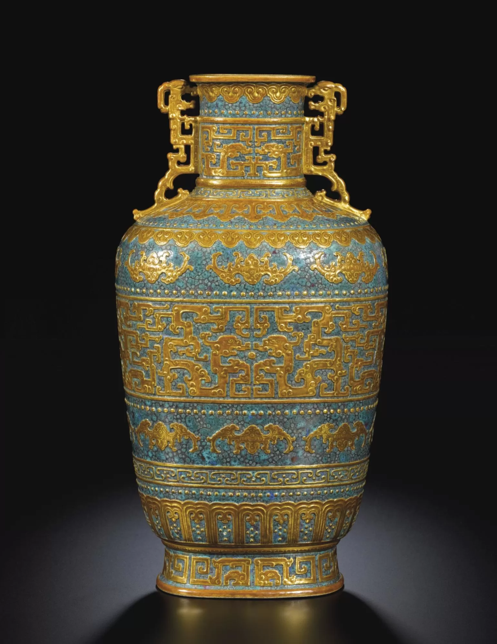 這件仿古銅式双耳瓶,高 38.6 厘米,器形仿先秦青銅壺,短頸斂口,扁圓鼓腹,頸部飾夔龍形双耳,造型敦實古雅,線條硬朗流暢,完美再現上古金石的莊重氣質。而瓶身的工藝組合,更是乾隆御窯「技藝巔峰」的直接見證。