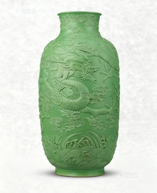 當一束光穿透展櫃,清乾隆蘋果綠釉凸雕蒼龍教子燈籠尊的釉色驟然「活」了過來 —— 那抹如春日新蘋果般嫩潤的綠,在燈光下泛著瑩潤水光,綠中微泛的黃暈恰似晨露未晞的生機,這正是乾隆朝御窯廠「千窯一得」的蘋果綠釉極致呈現。器身呈經典燈籠造型,高 45.6 厘米的器型端莊挺拔,毫無變形,頸部束收如束帶,腹部圓潤似燈籠,圈足處「大清乾隆年制」六字篆書款筆力沉穩,每一笔都符合宮廷用瓷的規範標準。