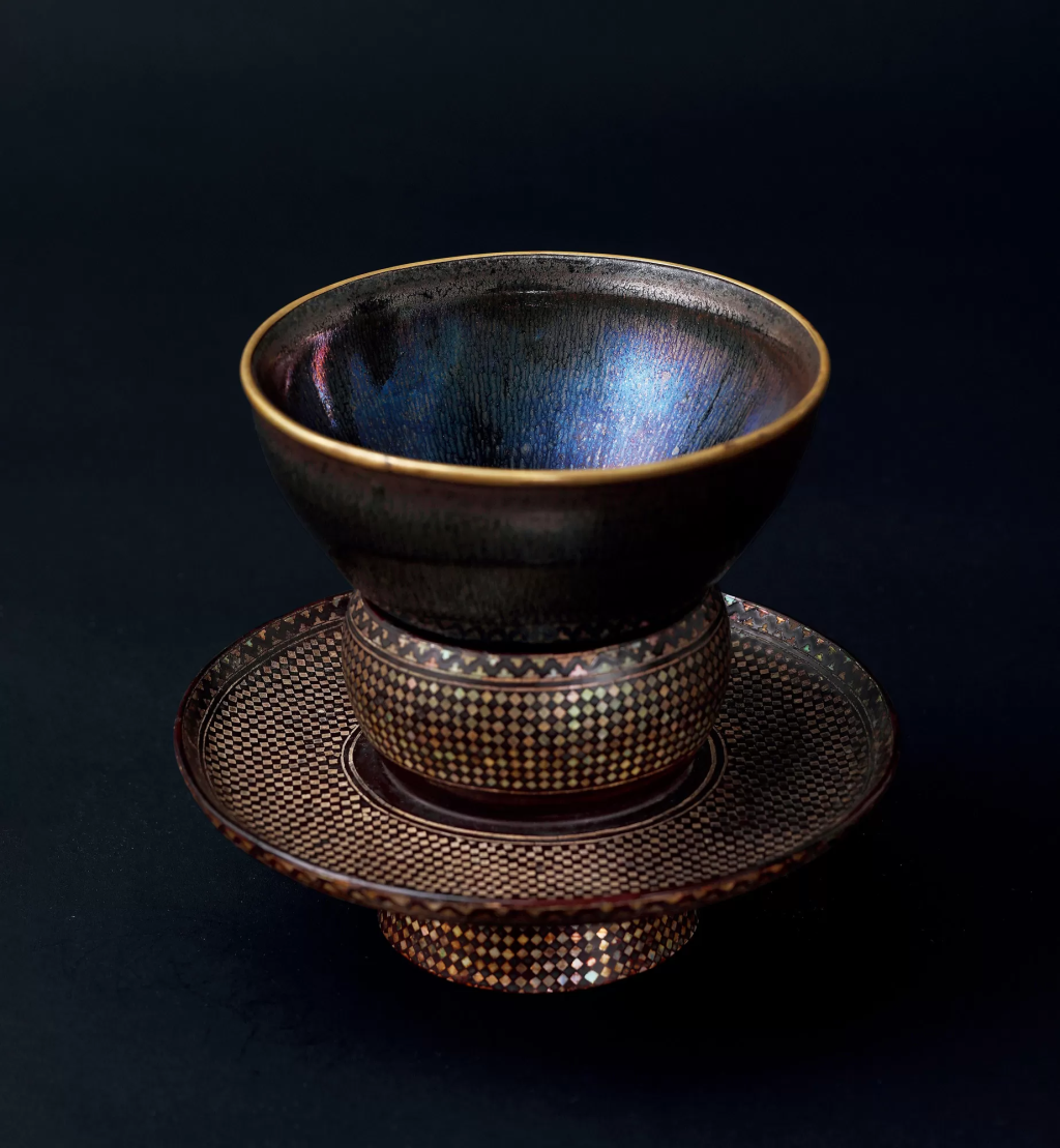 當茶席之上的燈光斜照入盞,明 藤田世傳藍兔毫「天目」茶盏中驟然浮現「萬毫攢聚」的奇景 —— 那抹極為罕見的藍色兔毫如流星墜落黑釉天幕,自盞心向口沿呈放射狀鋪展,毫纹細密如銀絲,在光線轉動間竟隱現紫藍暈彩,這正是《君台觀左右帳記》中「建盞之神品」的真實寫照。而托舉這件珍品的十四世紀黑漆嵌螺鈿盏托,更以「漆色如墨、螺鈿似星」的工藝,與茶盏形成跨越時空的藝術對話。