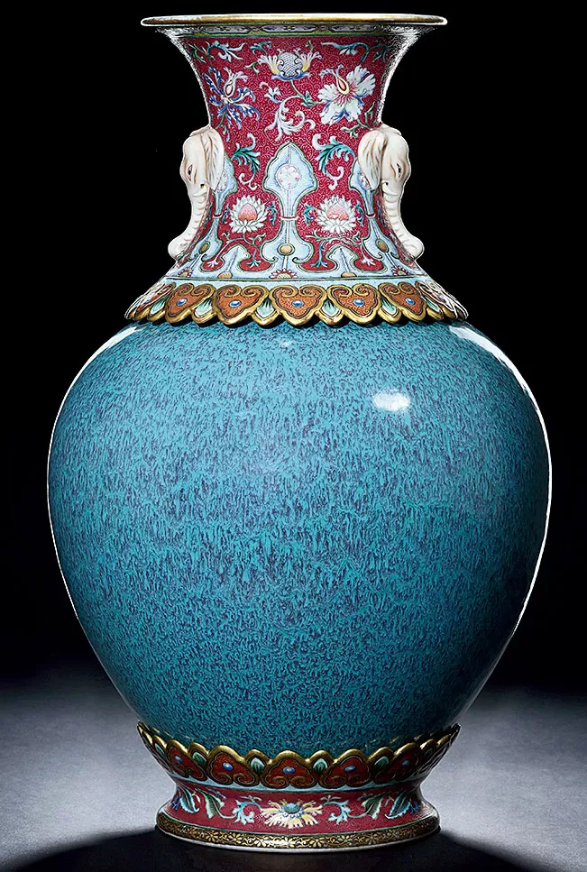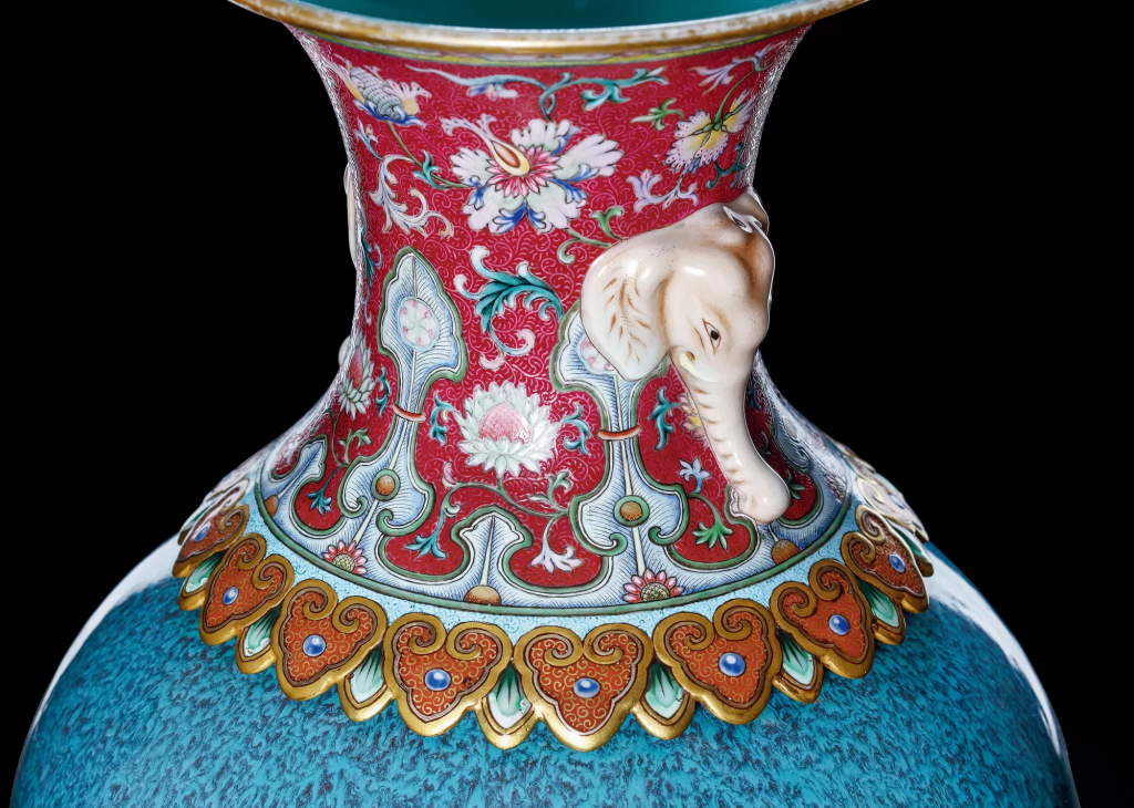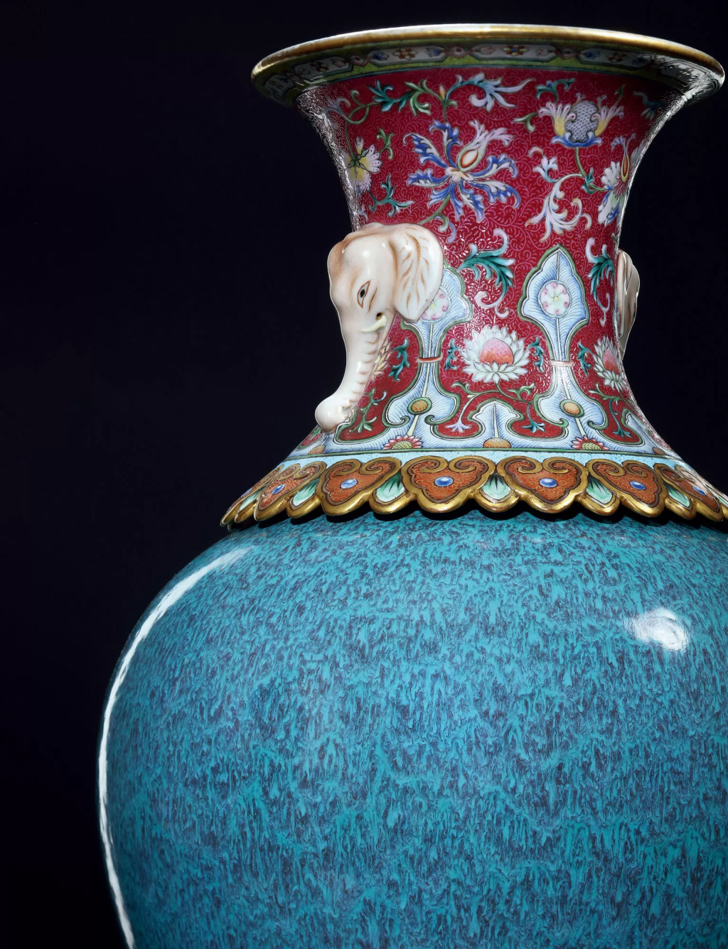 當一盞光線環繞清乾隆御制胭脂红地番莲花卉套炉钧釉太平有象转心瓶,這件高 48.2 厘米的禦瓷珍寶便如「活」過來般 —— 外瓶胭脂紅釉瑩潤如硃砂,釉面布滿細密「牛毛紋」開片,瓶身繪製的番蓮花卉以金彩勾邊,花瓣層疊間暗藏「纏枝連綿」的吉意;內層爐鈞釉呈現「紅藍交融如霞蔚」的窯變奇景,與外瓶胭脂紅形成「紅藍相契」的色彩對話;最精妙的是「轉心」結構,輕轉瓶頸,內膽「太平有象」紋飾便緩緩旋動,象鼻捲曲銜環、象背馱瓶的細節清晰可見,宛如一齣微縮的「宮廷祥瑞圖」。