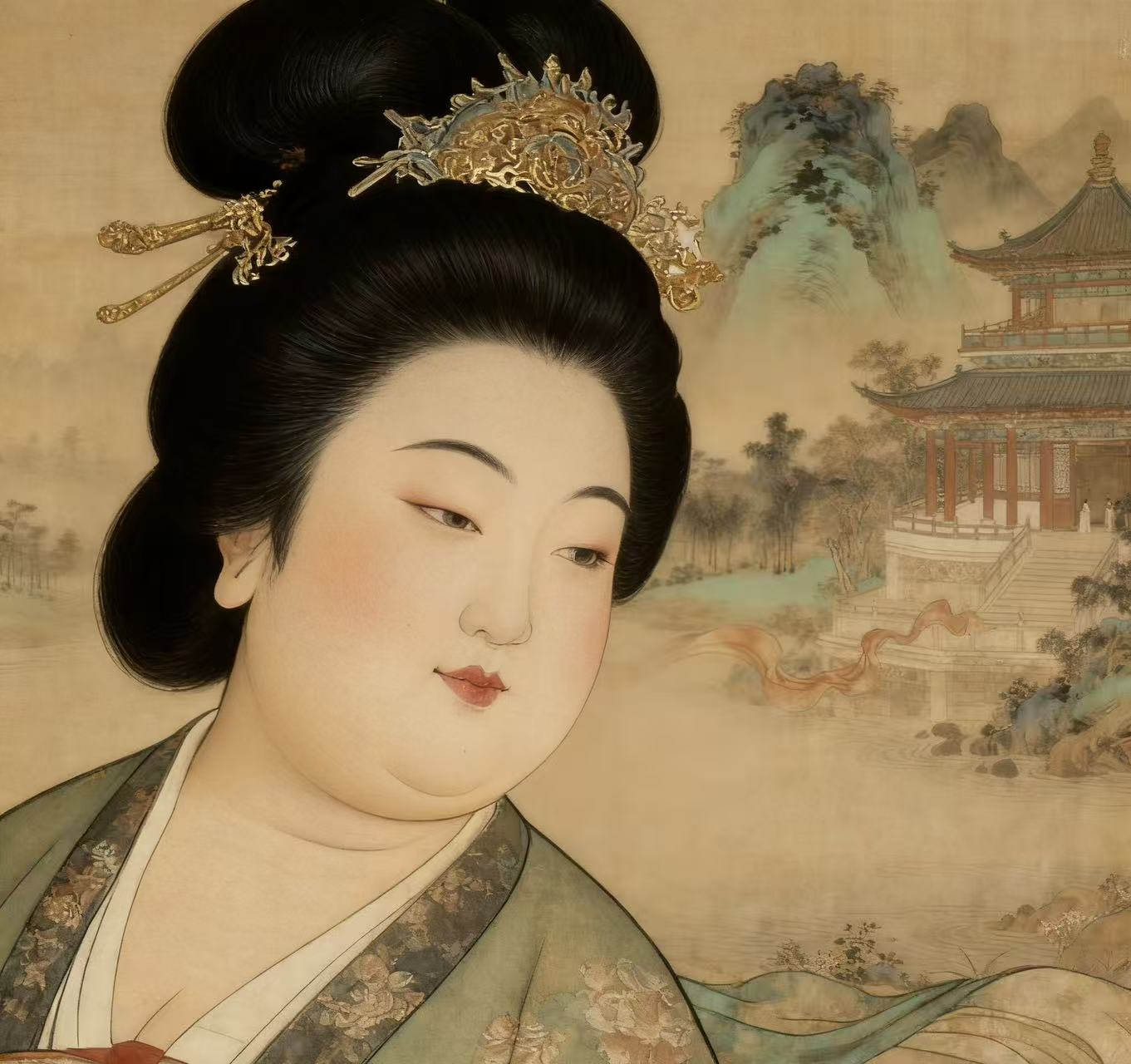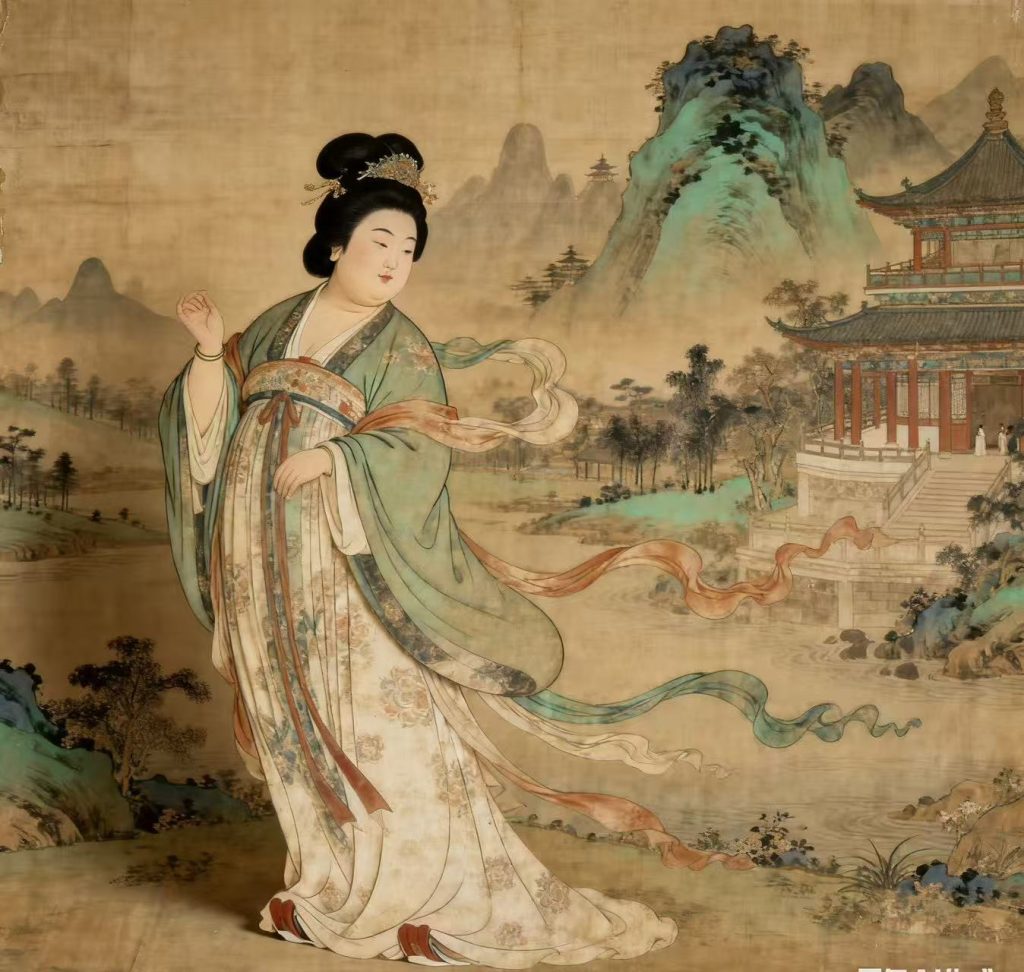 • 繪畫技法:仕女面容採用“暈染法”,肌膚豐腴潤澤,體現盛唐“以胖為美”的審美;衣紋線條流暢飄逸,具備“吳帶當風”的韻味;背景山水亭閣則融合了青綠山水的勾皴與界畫的精緻,將人物與景觀渾然一體,是對唐代仕女畫與山水畫技法的綜合運用;